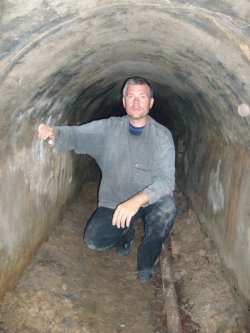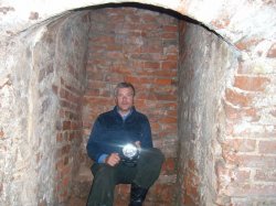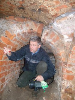 ![]() ![]() ![]() Как отметил Буховецкий Андрей, находится полуразрушенный вход в подземелье возле берега речки Полота возле Софийского собора. Как предположил краевед, образовался вход в подземелье именно благодаря оползню. Уникальность данной находки в том, что подземный ход на территории Верхнего замка обнаружился в первый раз. До этого географию полоцких подземелий ограничивали районом Николаевского собора и кадетским корпусом. ![]() ![]() ![]() ![]() Как рассказывал Буховецкий Андрей, в начале они слегка расчистили вход, а затем стали опускаться вниз, где уже обнаружили достаточно большой в рост человека ход. Ширина хода оказалась 1,3м., а высота 1,8м. Выложены свод и стены красным большим кирпичом скорее всего 18 века. На стенах над головой можно обнаружить следы копоти, предположительно от факелов. Костыли из метала были вбиты в стены хода. Пройти удалось только 80 метров, далее идти стало душно. Пройденный участок оказался без завалов, сухим. Сам ход ведет в сторону Софии, где стоял когда-то монастырь. Краеведы из Полоцка точное положение места хранят в тайне, в ближайшее время они планируют провести детальное исследование с самыми новыми спецсредствами. Буховецкие – достаточно известны среди археологов Полоцка. Еще с середины 90-х братья изучают дренажную систему Полоцка и его подземные коммуникации, при этом исследуют материальную культуру города. Также краеведы участвовали в археологических раскопках, которые были в городе. Вместе проводили сезонное наблюдение за культурным слоем в месте строек, собирали при этом подъемный материал. Также Буховецкие занимались реконструкцией культовых построек Полоцка, делали храмовые макеты. ![]() ![]() ![]() ![]() Данное подземелье, кстати, уже не первое из тех, которое нашли Буховецкие. Буховецкий Андрей с гордостью рассказывает о своем первом найденном подземном ходе. Произошло это еще в 2005. О первом подземном ходе Как вспоминает Андрей, началось все буднично. В 2005 году 31 июля в субботу рано утром обходил берег Западной Двины. Археолога заинтересовал участок провалившейся земли возле берега. После этого он стал снимать лопатой слой земли, после этого стало видно красный кирпич и известковый раствор. Как отметил Буховецкий, тут то он понял, что тут был дренаж, который засыпали или просто обвалился берег реки. После половодья часть земли уносила высокая вода. Как можно было убедиться, на береге З.Двины был сводчатый дренаж. После осмотра места археолог пришел к выводу, что все это является частью иезуитского коллегиума, однако так как земли было много, дренаж пришлось прикрыть ветками и уйти. Вечером при встрече со своим братом Алексеем Андрей отметил, что нашел дренаж, который может вести в сторону иезуитского коллегиума. Уже четвертого августа братья решили вместе прийти на место и все обследовать, захватив при этом с собой лопату, фонарик, свечи. Уже на месте быстро отбросив землю и разобрав отвалившиеся кирпичи археологи пролезли внутрь дренажа, включили фонари и с удивлением обнаружили, что внутри можно стоять в полный рост немного согнув спину. Уже осветив фонариком глубину дренажа братья отметили, что внутри все выложено большим красным кирпичом, известковым раствором. Кирпичный свод оказался над головой. По ходу двигаться можно было только друг за другом, в начале дренажа было достаточно сыро, 